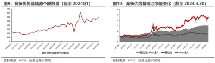 从数量上看,竞争优势基础池个股数量大约是全A个数的10%-15%之间。从净值曲线看,等权配置下的竞争优势基础池显著优于wind全A指数。自2010年至2024年4月30日,实现年化收益11.7%,最大回撤-46.1%。