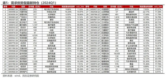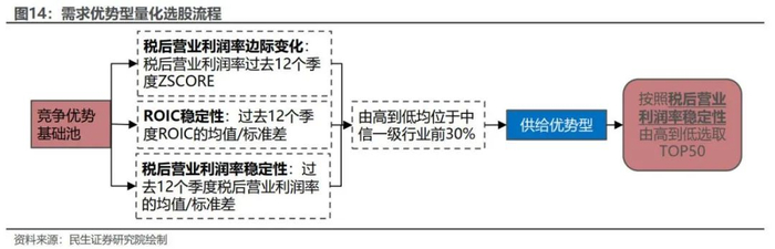 我们从竞争优势股票池中选择具有需求优势型的个股。我们要求选取的个股在税后营业利润率时序稳定性、税后营业利润率边际变化和ROIC时序稳定性三个方面均位于中信一级行业内前70%,并首先选取税后营业利润率时序稳定性最高的前50个个股。这样的选择逻辑是基于以下理由:我们希望选取具有相对较高ROIC的个股,并且高ROIC来自于需求侧,这意味着该公司具有需求侧优势。类似地,我们同样要求这种需求侧优势在边际上得到强化。