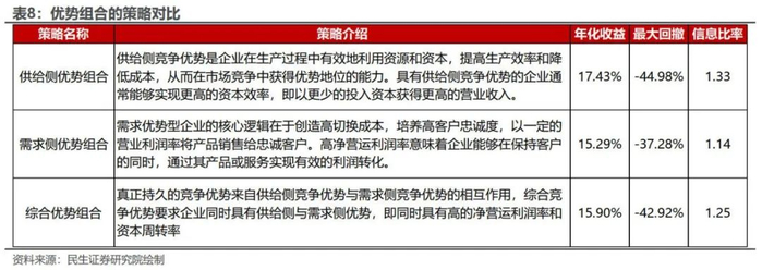 如果一家企业通过高NOPAT利润率实现高ROIC,应该将分析重点放在客户锁定上。如果公司的高回报来自高投资资本周转率,应该强调成本领先分析。由此可以构建三种竞争优势来源下的选股组合:供给优势组合、需求优势组合和综合竞争优势组合,三种组合均可以实现稳定战胜基准。