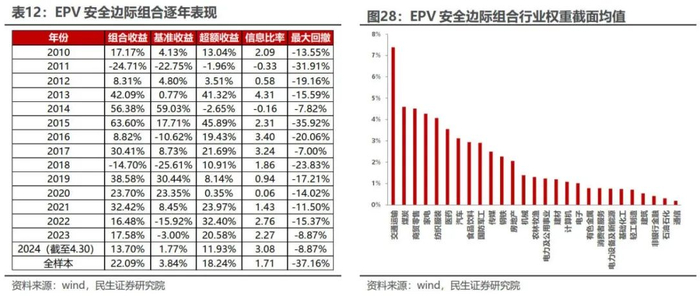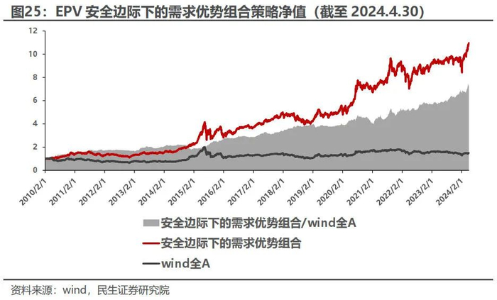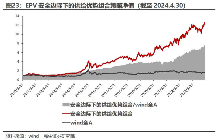 EPV安全边际指标能够反映出企业的盈利能力相对于市场价值的保守性估计。我们按照上述方法来评估企业的盈利能力价值。首先,我们计算公司的滚动三年净经营利润(NOPAT)的波动率。若该波动率较小,即低于全市场70%分位数,我们将计算得到的EP除以5%,以得到企业的盈利现值(EPV)。然后,我们将盈利现值与企业市值相比,得到EPV安全边际指标。同时,该方法要求企业破产风险较小、稳健经营,我们以前文的三个竞争优势组合分为为基础池,在其内选择EPV安全边际最大的前50只,季度调仓。