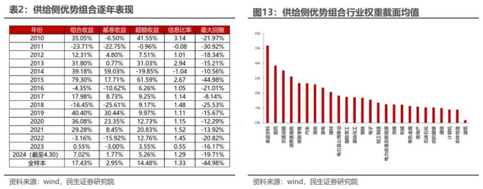 供给优势组合在回测期内实现年化收益17.3%,日度最大回撤-44.98%,相对于wind全A的信息比率1.33。从行业分布上看,食品饮料、医药和交运行业历史上配置比例较多。