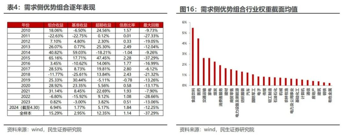 需求优势组合在回测期内实现年化收益15.12%,日度最大回撤-37.3%,相对于wind全A的信息比率1.15。从行业分布上看,食品饮料、医药和交运等行业历史上配置比例较多。