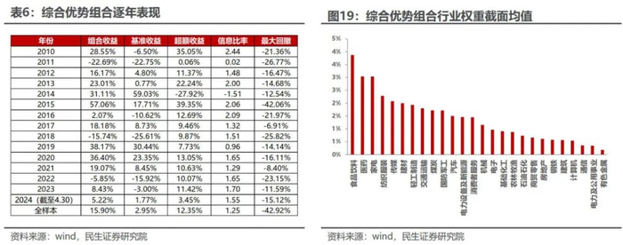 综合优势组合在回测期内实现年化收益15.90%,日度最大回撤-42.9%,相对于wind全A的信息比率1.25。从行业分布上看,食品饮料、医药和家电行业历史上配置比例较多。