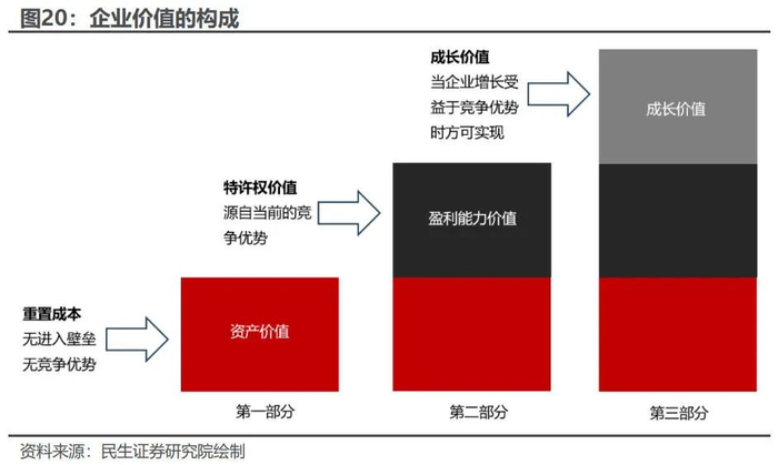 根据格林沃尔德和巴菲特等人的理论,企业价值由三个部分构成:资产价值、盈利能力价值以及成长部分的价值。由于不同企业的远期成长难以估计,我们这里只考虑资产价值和盈利能力价值作为企业价值的保守估计。