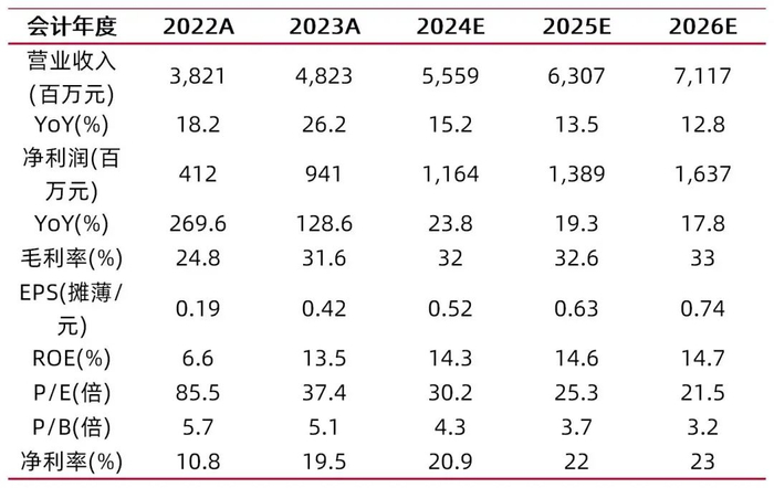 2024年4月22日,公司发布2023年年报及24年一季报。公司23年营收48.23亿元(+26.24%),归母净利润9.41亿元(+128.56%)。24年Q1营收15.23亿元(+19.96%),归母净利润3.53亿元(+100.98%)。