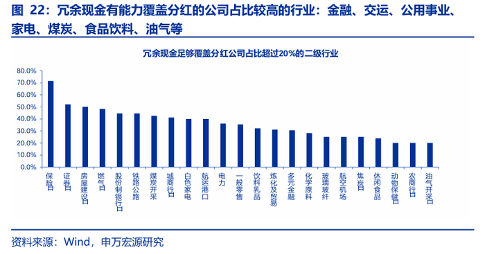 (1)现金健康度:通过计算各行业冗余现金有能力覆盖分红的上市公司占比。其中冗余现金的计算方法为企业自由现金流(FCFF)减去营运资本(Working Capital),选取冗余现金为正的结果。