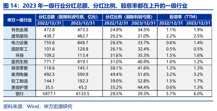 2023年行业分红总额、分红比例和股息率均提升的一级行业为:有色金属、建筑装饰、电力设备、国防军工、环保、医药生物、商贸零售、家用电器、轻工制造、美容护理和银行。