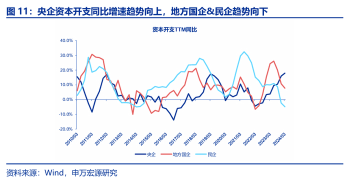 央企承担更多资本开支功能,地方国企和民营企业资本开支意愿下降:2022年以来央企资本开支同比增速(TTM)趋势向上,24Q1为17.9%,位于2010年以来100%分位数,而地方国企资本开支同比增速(TTM)自23Q2开始下行,24Q1为7.7%,位于2010年以来50%分位数。民营企业资本开支同比增速(TTM)自21Q2开始趋势下行,24Q1为-4.9%,位于2010年以来2%分位数。