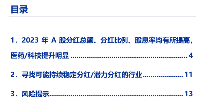 1.2023年A股分红总额、分红比例、股息率均有所提高,医药/科技提升明显