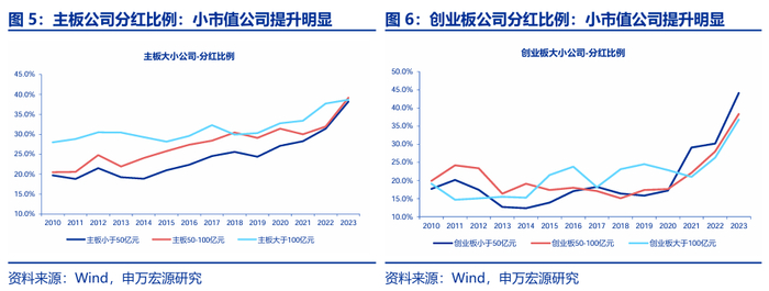 大小公司:以收入划分,非金融石油石化前1/4公司分红比例从39.9%提升到44.3%,后1/4公司分红比例从32.0%提升至40.8%。以市值划分,主板市值100亿以上公司分红比例从37.7%提升至38.7%,50亿以下公司分红比例从31.4%提升至38.2%。创业板市值100亿以上公司分红比例从26.3%提升至36.8%,50亿以下公司分红比例从30.2%提升至44.1%。