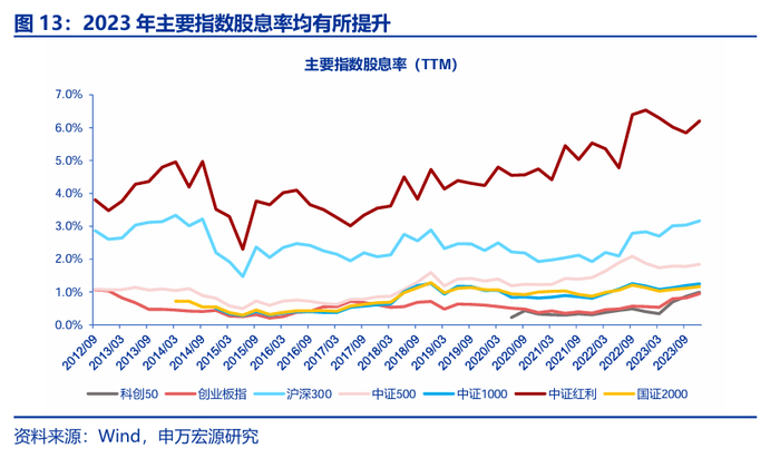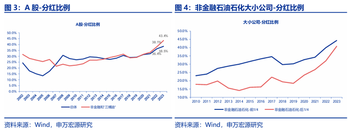 我们前期重点提示分红比例上升的动态逻辑,2023年全部A股分红比例由2022年38.1%提升至43.4%,大小公司、各大类板块总体均有提升: