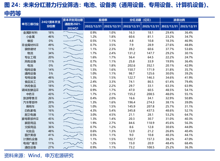 在2023年已披露财报的基础上,(1)我们通过现金健康度、资本开支稳定程度和盈利能力稳定程度筛选可能持续稳定分红的行业:金融、交运、公用事业、家电、食品饮料、油气等,(2)通过当前分红能力和资本开支意愿,筛选未来潜力分红的行业:电池、设备类(通用设备、专用设备、计算机设备)、中药等。