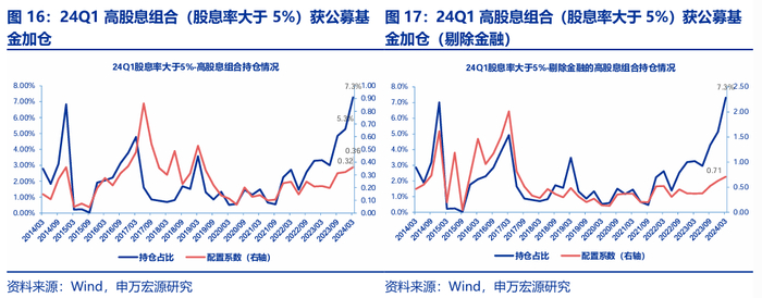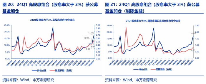 以股息率大于3%的个股组合:当前公募对其持仓占比为17.1%,较23Q4提升6.2个百分点,配置系数为0.54倍,较23Q4提升0.12。