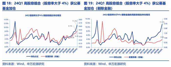 以股息率大于4%的个股组合:当前公募对其持仓占比为11.2%,较23Q4提升3.1个百分点,配置系数为0.47倍,较23Q4提升0.08。