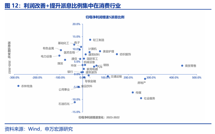 2023年利润增速改善+派息比例提升主要集中在消费和部分制造行业:商贸零售、轻工制造、美容护理、纺织服饰、家用电器,以及国防军工、机械设备、汽车等。