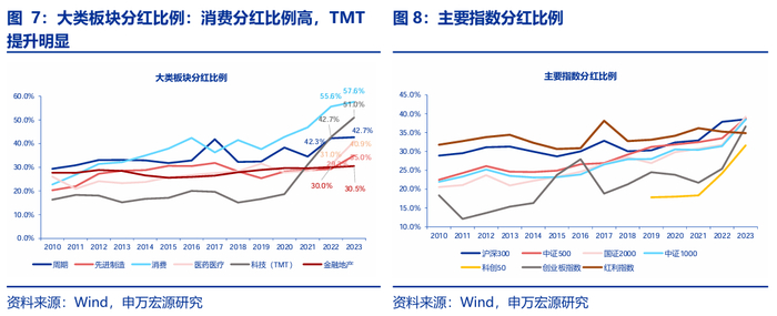 大类板块:2023年周期、先进制造、消费、医疗、科技(TMT)、金融地产分红比例相较于2022年均有所提升。消费板块分红比例最高为57.6%,医药、科技板块分红比例提升幅度较大,医药分红比例从2022年的31.0%提升至2023年的40.9%,科技板块分红比例从2022年的42.7%提升至2023年的51.0%。