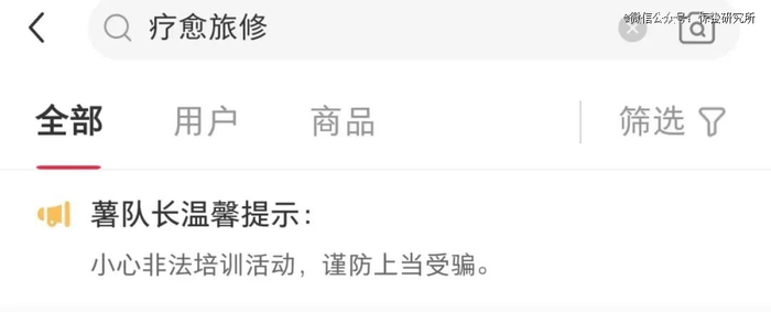 譬如说,在小红书平台搜索关键词“疗愈旅修”就会被提醒“小心非法培训活动,谨防上当受骗”。可见目前疗愈师培训行业还缺乏严格监管,市场相当混乱。