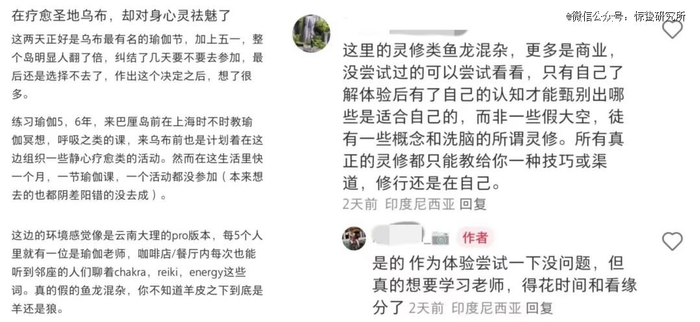 另外,也有网友吐槽巴厘岛疗愈圣地乌布商业机构鱼龙混杂,质量良莠不齐。消费者往往难以辨别哪些是真正的高质量疗愈服务,容易受到低质量或欺诈性产品的误导。