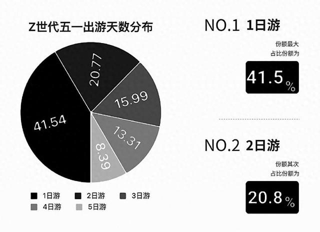 “Z世代”更倾向于充分利用假期时间,延长出游时长以获得更丰富的旅行体验,偏好“打卡”和“特种兵式旅游”。电信大数据显示,今年“五一”流行多个城市出行,“Z世代”人均驻留城市数达到了2.04个。随之而来的是出游天数的增加,在为期5天的小长假中,“Z世代”平均出游天数达到2.26天。“Z世代”的出游高峰时段主要集中在15时至21时之间,同时,超过20%的“Z世代”游客选择在夜间出游,带动了相关服务业的增长,为夜间经济的蓬勃发展注入新动力。