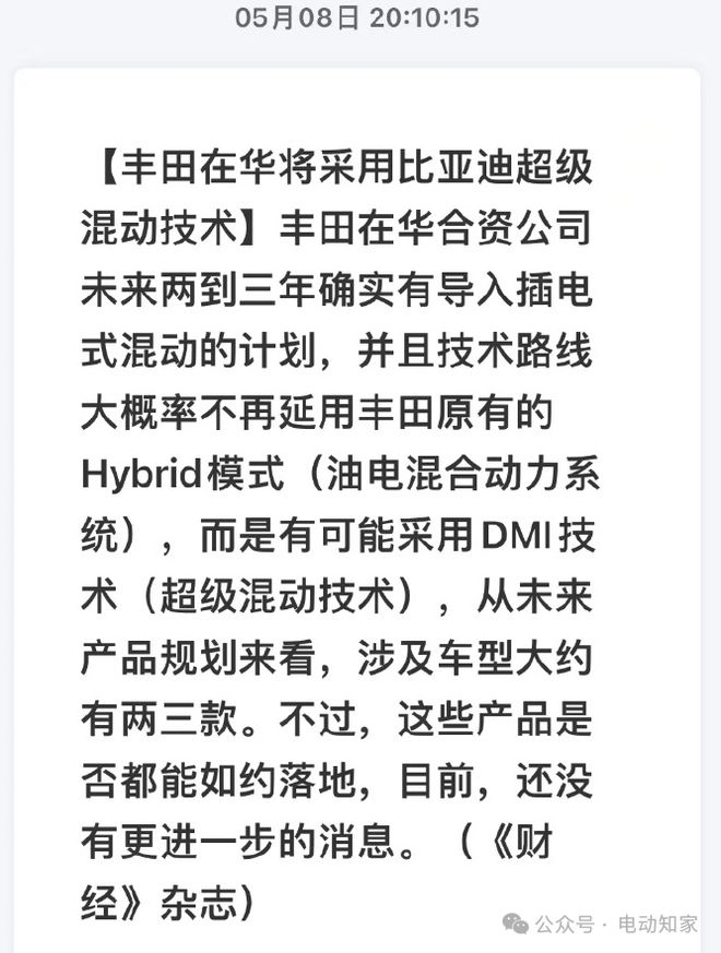 电动知家消息,据国内媒体报道,丰田在华合资公司未来两三年,有导入插电式混动车型的计划。并且,技术路线大概率不再延用丰田原有的Hybrid模式(油电混合动力系统),而是有可能采用比亚迪的DMI技术(超级混动技术)。另有知情人士透露,此次丰田之所以倾向采用比亚迪DMI技术,核心因素之一是其成本较低,另外技术也相对成熟。