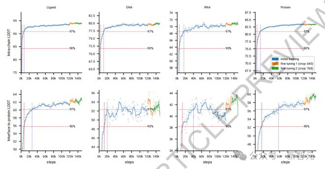 然而,模型在学习整体结构方面需要更长的时间(界面指标上升较慢,蛋白质-蛋白质界面LDDT在60,000步之后才达到97%的标准)。
