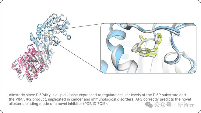 下面是,AlphaFold 3正确预测了一种新型抑制剂的变构结合模式(PDB ID 7QIE)。