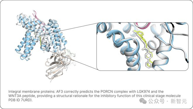AF3还正确预测了PORCN与LGK974和WNT3A肽的复合物,为临床阶段分子的抑制功能提供了结构依据(PDB ID 7URD)。