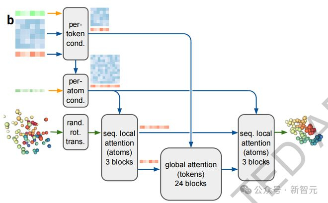 最终,成对和单一表征连同输入表示一起传递到新的扩散模块(图2b),该模块取代了AlphaFold 2的结构块。