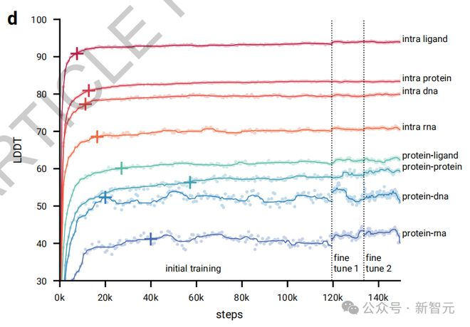 如图2d所示,在初始训练阶段,模型很快就能预测出局部结构(所有内链指标迅速提升,在前20,000次训练步骤中就达到了最大性能的97%)。