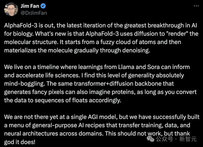 英伟达高级科学家Jim Fan称赞道,「AlphaFold 3是生物AI取得最大突破的最新迭代版本。不同以往,AlphaFold 3使用了『Diffusion』来渲染分子结构。它从一团模糊的原子云开始,然后通过去噪逐渐将分子实体化」。