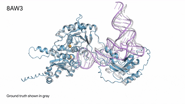 7R6R - DNA结合蛋白:AlphaFold 3对一个分子复合体的预测展现了蛋白质(蓝色)与DNA双螺旋(粉色)的结合,其预测结果与通过繁复实验得到的真实分子结构(灰色)高度吻合