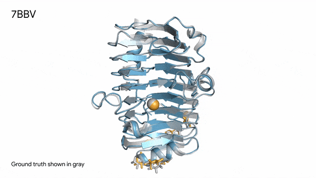 7BBV - 酶:AlphaFold 3对一个包含酶蛋白(蓝色)、离子(黄色球体)和简单糖(黄色)的分子复合体的预测,以及其真实结构(灰色)。这种酶源自一种对多种植物有害的土传真菌(Verticillium dahliae)。深入了解这种酶与植物细胞的相互作用有助于研究人员培育出更健康、更抗逆的作物