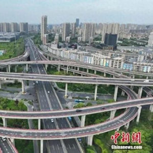 杭州一座高架互通上月季花盛放。(无人机照片) 中新社记者 王刚 摄