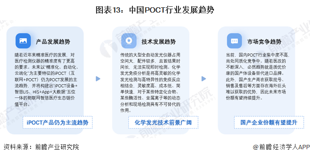 在产品发展趋势上,随着近年来精准医疗的发展,对医疗检测仪器的精准度有了更高的要求,未来以“精准化、自动化、云端化”为主要特征的iPOCT(互联网+POCT)仍为POCT发展的主流趋势;在技术发展趋势上,化学发光免疫分析是将高灵敏的化学发光检测与高特异性的免疫反应相结合,灵敏度高、成本低、简单快速,对于某些特定化合物、某些酶活性、金属离子等的动态分析和现场检测具有不可替代的作用,是POCT发展趋势之一;在市场竞争趋势上,随着医改的不断深入,必然趋势就是质优价廉的国产体设备替代进口品牌。此外,国产生产商在获取批号、销售及售后等方面存在海外巨头难以获取的优势,因此未来市场份额有望持续提升。