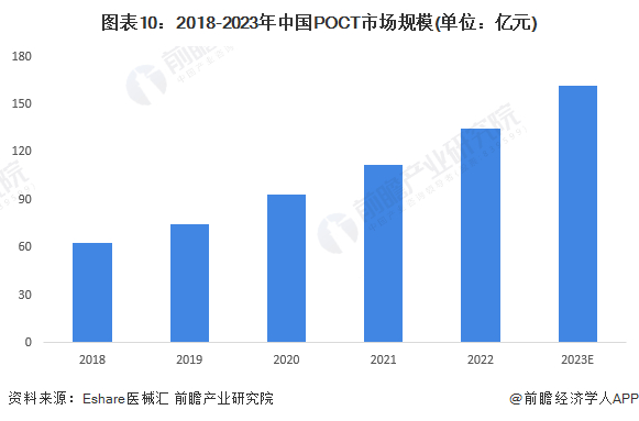 随着疾病防控、突发急救、个人健康管理等诸多应用场景下需求的不断增长,POCT诊断得以快速发展。据Eshare医械汇测算,2022年POCT诊断市场规模达135亿元,同比增长20.54%。2023年,POCT市场规模约超160亿元。