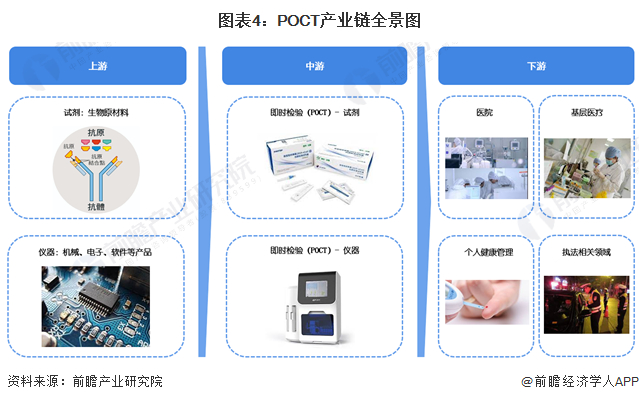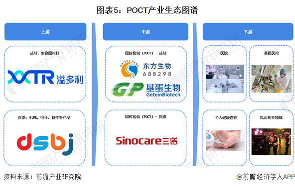 目前,我国POCT中游主要分为试剂和仪器,其中仪器的上游主要包括机械、电子、软件等产品行业,试剂的上游主要包括化学制品与抗原、抗体、酶、血清等生物制品行业。POCT的下游为医疗机构、第三方诊断外包机构、家庭及个人健康管理等相关领域等。
