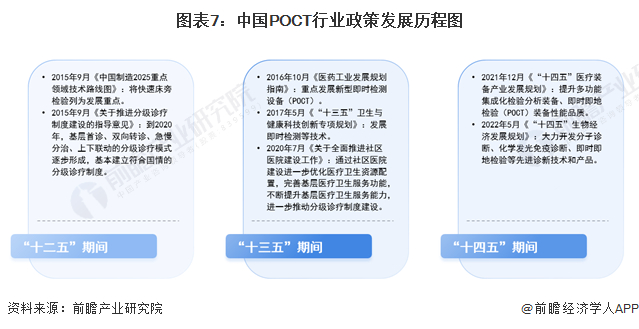 从政策历程来看,“十二五”期间,我国出台《中国制造2025重点领域技术路线图》,将快速床旁检验”列为发展重点,同时积极推进分级诊疗制度;“十三五”期间,我国出台《医药工业发展规划指南》,提出重点发展新型即时检测设备(POCT),并进一步推动分级诊疗制度建设;“十四五”期间,我国出台《“十四五”医疗装备产业发展规划》《“十四五”生物经济发展规划》,明确要大力开发即时即地检验等先进诊新技术和产品,提升即时即地检验(POCT)装备性能品质。