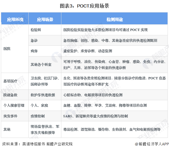 按照应用场景来分,POCT产品既可供大型医院、基层医院的病房、门诊、急诊、检验科、手术室、监护室使用,也可供社区门诊、体检中心、检验实验室使用,还可供患者个人快速便捷使用,应用场景广阔。