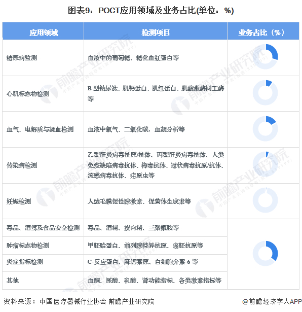 按照对应检测项目和应用领域,POCT可分为不同的产品系列,常见的POCT试剂有感染性疾病系列、心脑血管疾病系列、肾脏疾病系列、糖尿病系列、妇产科优生优育系列、健康体检系列等。从应用领域占比来看,目前糖尿病检测市场占比较高,业务占比在30%左右。