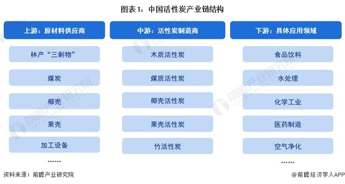 活性炭的原材料主要包括林产“三剩物”(木质活性炭及竹活性炭)、煤(煤质活性炭)、椰壳果壳(椰壳果壳活性炭)以及磷酸等活化剂,另外,活性炭生产过程中各类专用设备也不可或缺;而活性炭行业的下游则包括食品医疗行业、水处理、化学工业、医药制造和空气净化等多个行业。