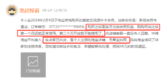 近期有多位消费者向黑猫投诉平台反馈,自己通过淘宝店铺购买各大音乐、视频平台会员,店铺表示由于价格较优惠所以到账方式与普通年费有一定区别,会员权益会按月发放,消费者也可通过店铺提供的链接每个月进行自助领取,但消费者充值会员后仅仅使用两三个月,店铺便关店跑路,剩余时长既无法领取也无法退款,淘宝客服介入后表示店铺账户内无保证金无法退款,只能向卖家催缴,但催缴最后也大多不了了之。