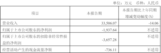 2024年第一季度报告显示,今年第一季度,公司实现营业收入33,506.07万元,同比减少14.06%;归属于上市公司股东的净利润-1,937.64万元;归属于上市公司股东的扣除非经常性损益的净利润-3,657.28万元;经营活动产生的现金流量净额-736.11万元。