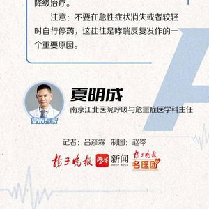 注意:不要在急性症状消失或者较轻时自行停药,这往往是哮喘反复发作的一个重要原因。