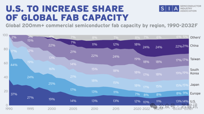美国在全球晶圆厂产能中所占的份额经历了数十年的下降,从1990年的37%下降到2020年的12%,到2022年进一步下降到10%。