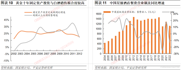 基建投资拉动商务需求,白酒进入黄金十年。2003年以来,我国固定资产投资拉动经济快速增长,而大量的基础设施投资催生了政商务接待需求,消费者品牌意识增强,对于名优酒需求进一步增加。与此同时,洋河、五粮液、茅台等名优酒企积极推进改革,供给持续扩容,白酒消费进入黄金十年。据国家统计局,2003-2011年,我国固定资产投资完成额CAGR为26.5%,同期规模以上白酒收入CAGR达27.3%,体现出较高的拟合度。