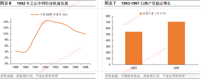 名酒价格管制放开,白酒市场化程度增加。1988年,国务院开放茅台、五粮液、古井贡酒等13种名酒价格管制,原有的计划经济价格体系开始瓦解。1992年邓小平南巡后讲话后,我国经济重回高速发展,1992年GDP增速高达14.2%。白酒行业经过3年的调整后逐步进入繁荣期,虽然仍然处于卖方市场,但消费者议价能力开始提高,对于品牌的意识也逐渐加强。行业广告营销盛行,其中孔府家、孔府宴、秦池凭借广告出圈。据中国酒业协会,1997年我国白酒产量达到709万千升,较1993年543万千升提升30%。
