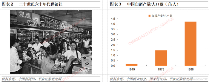 统购统销阶段,供销社等国营渠道为销售主体。建国初期,我国粮食生产力水平落后、物资短缺,白酒实行“统购统销”。白酒需要经过省级工商行政管理局批准,才能组织生产,整体处于供小于求的卖方市场,消费者可选择空间小、议价能力较弱,对于产品品质、品牌追求不高。据中国酒业协会与国家统计局,1949/1978年中国白酒产量分别为11/144万千升,对应人均产量分别为0.2/1.49升/人,生产力水平较低。在该阶段,销售渠道主要为国有的供销社等,由于人口流动水平较低,餐饮渠道发展较慢。