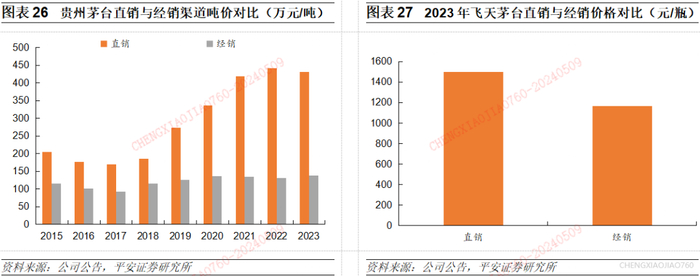 大单品直销更具性价比,增厚利润、加强渠道管控力。尽管对于大部分白酒公司来说,经销渠道更具备性价比,但对于具备消费者认知度的大单品,直销渠道更具有吸引力,考虑到:1)直销渠道能够将更多的利润留存在上市公司体内,如飞天茅台经销商打款价为1,169元,而直销的价格为1,499元,2023年年报显示,茅台直销渠道吨价为430万元/吨(包含标品及非标品),高于经销渠道的139万元/吨;2)经销渠道模式下,厂家与终端消费者并不直接接触,而直销模式下,厂家对于终端消费者以及价格的掌控力更强,能够更好地把握投放节奏。