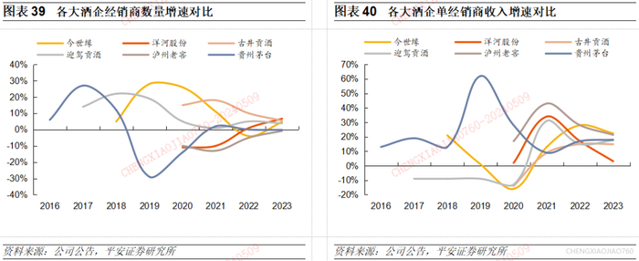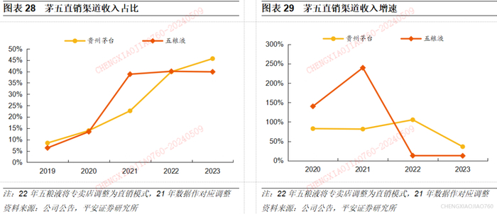 名酒加大直销投入,茅五直销收入占比持续提升。据公司财报,以茅五为代表的名酒近年来持续加大直销渠道布局,2019-2023年收入CAGR分别达75%/79%,高于收入整体,直销渠道占比亦持续提升,2023年分别达45.7%/39.8%,较2019年分别提升37.2/33.5pct。