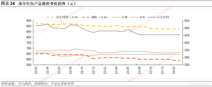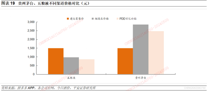 电商渠道一定程度拉低产品成交价,稀释品牌价值。2024年4月22日,普五烟酒店零售价约980元/瓶,而拼多多百亿补贴价为859元/瓶,飞天茅台的拼多多百亿补贴价同样较烟酒店零售价格低380元/瓶。电商渠道的补贴,在一定程度上促进了名酒的销售,但过低的线上成交价也影响了产品原有的价格体系,导致传统经销商利润较薄,稀释品牌价格。